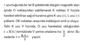 - şekildeki magnetik alan içindeki uzunluğunda tel V hızıyla sağa doğru çekiliyor. Sağ el kuralına göre dört parmak B magnetik alanını sağ başparmak V hızını gösterirse avuç içi (+) yüke etkiyen kuvveti gösterir. Bu durumda tel içindeki (+) yükler L ucunda (–) yükler K ucunda toplanır.